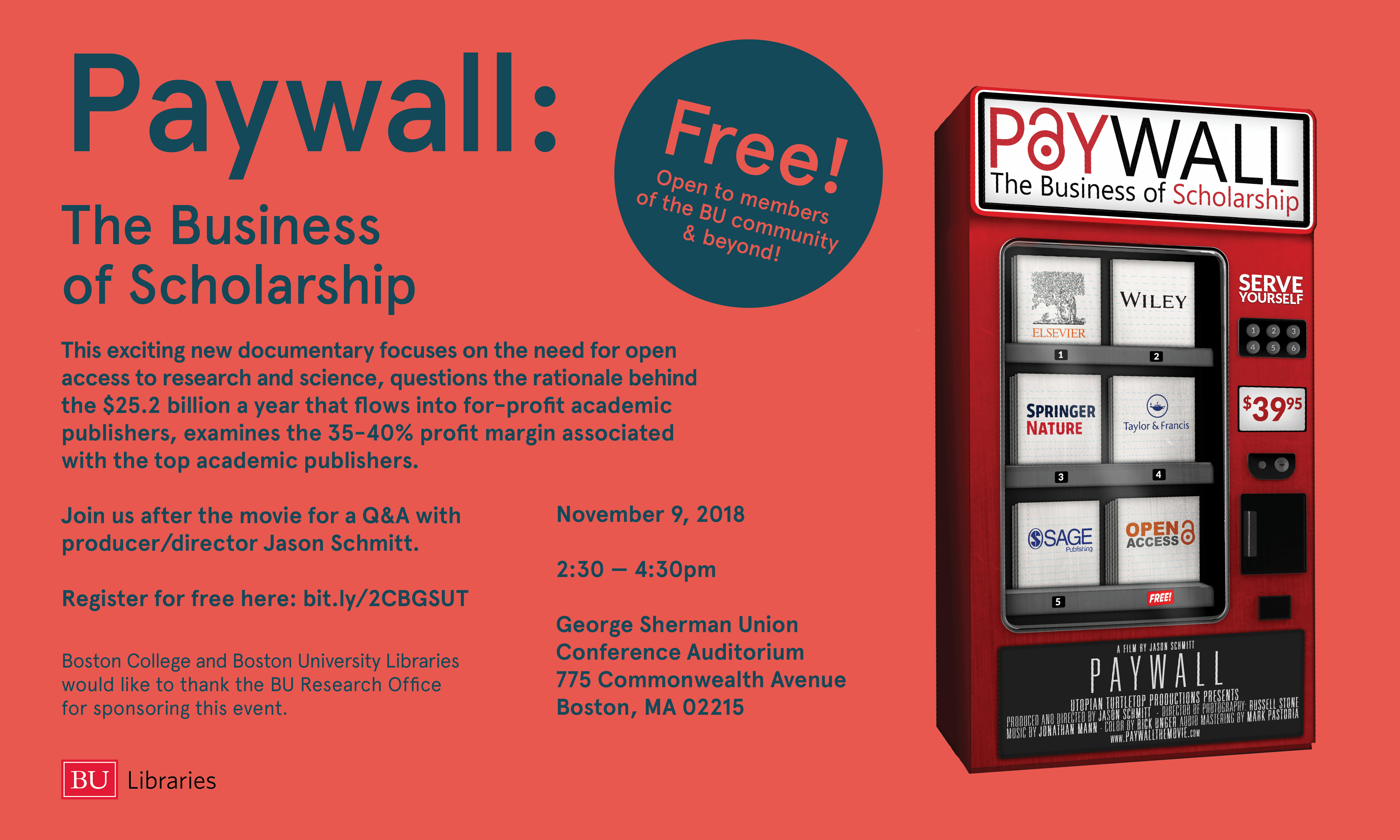 "Paywall: The Business of Scholarship" BU Libraries poster