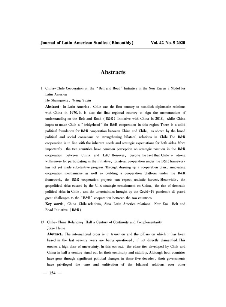J. Heine. 2020. "Chile-China Relations : Half a Century of Continuity and Complementarity." Journal of Latin American Studies Beijing, Volume 42, Issue 5, pp. 13 - 25 (12).
