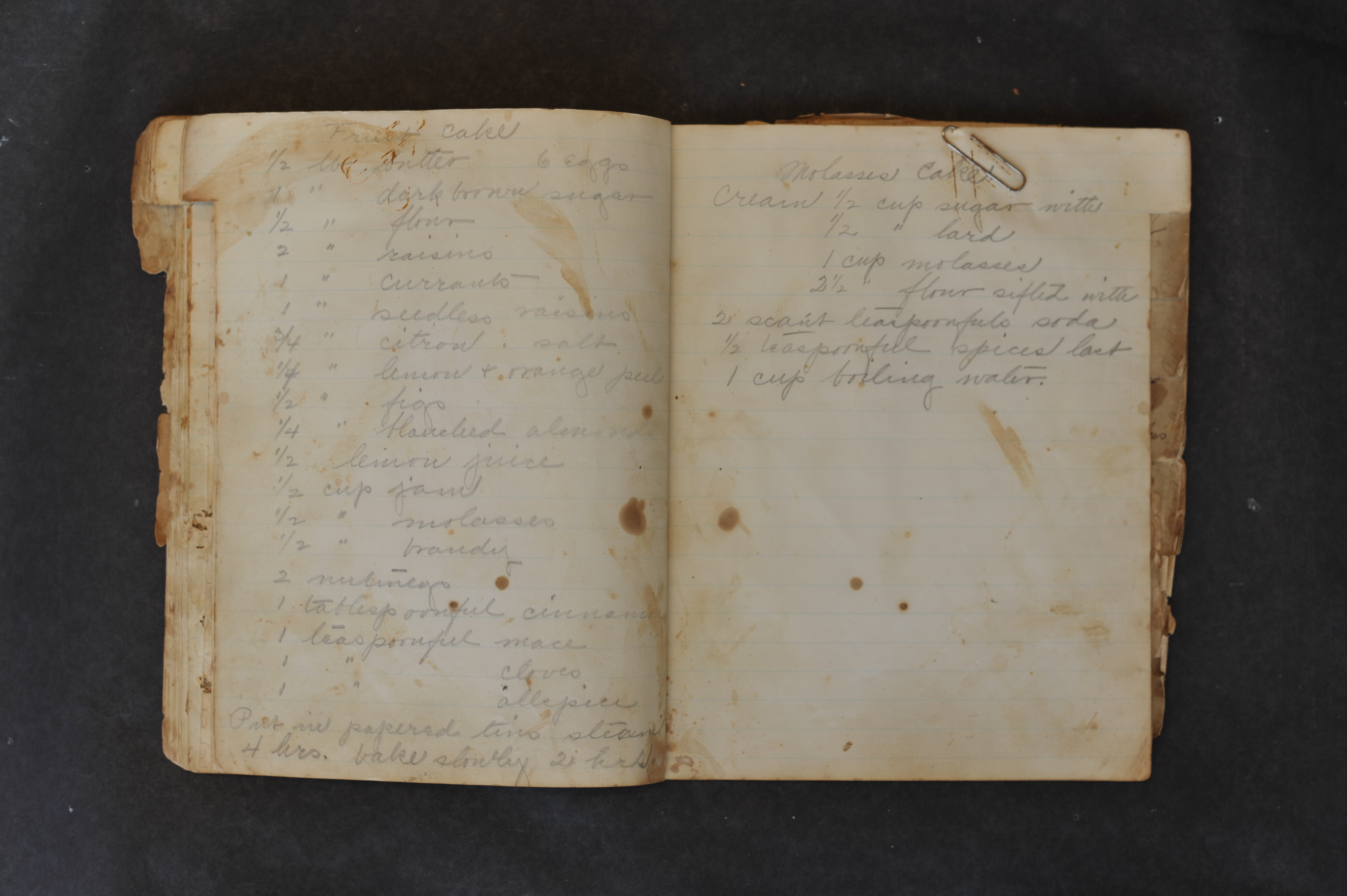 Paperback notebook. 62 items: mostly handwritten recipes in pencil and ink, also newspaper clippings. Includes a fragment of a Chautauqua Cookbook. Baking recipes, pickles and preserves.