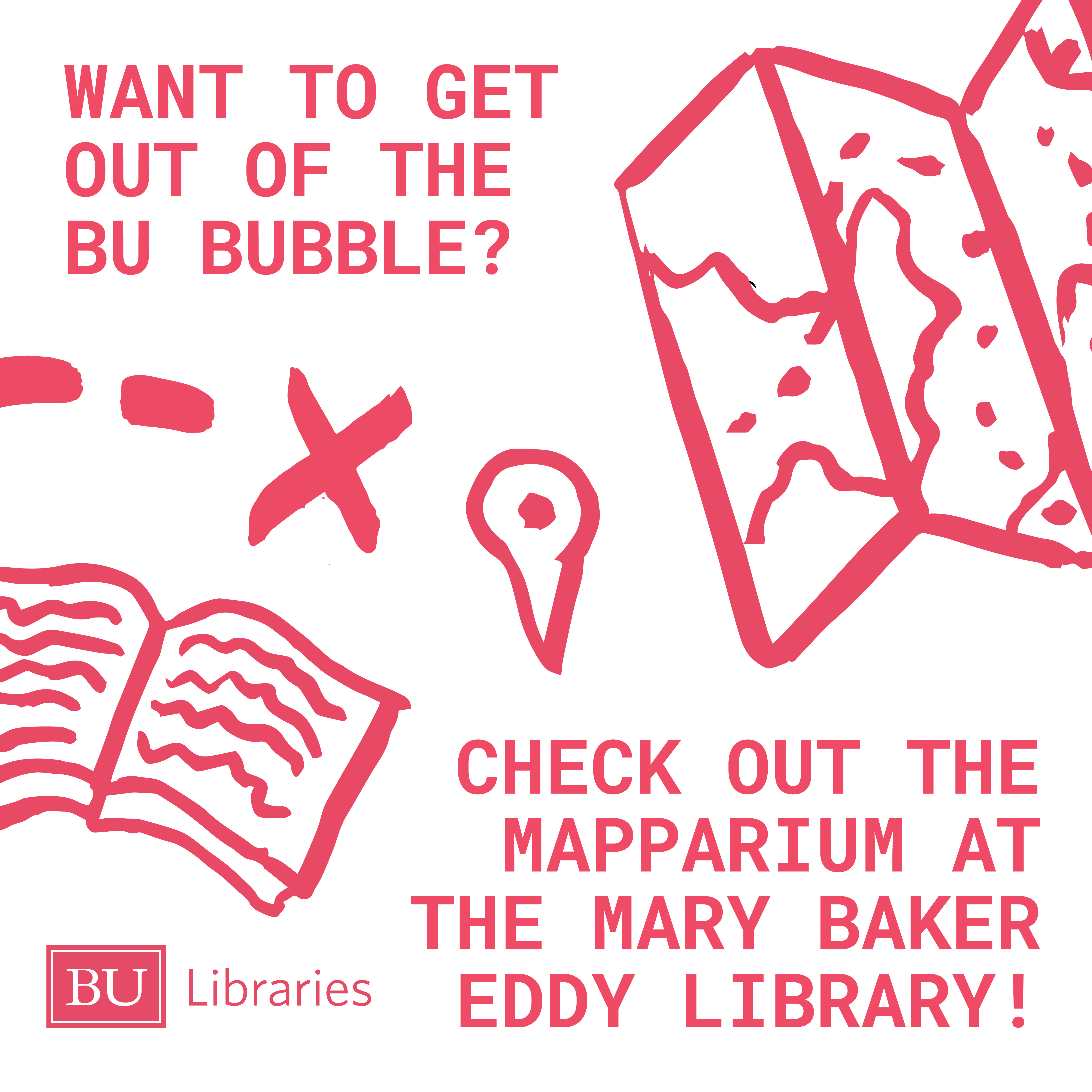 An advertisement to visit the Maparium at the Mary Baker Eddy Library in order to escape the BU "bubble."