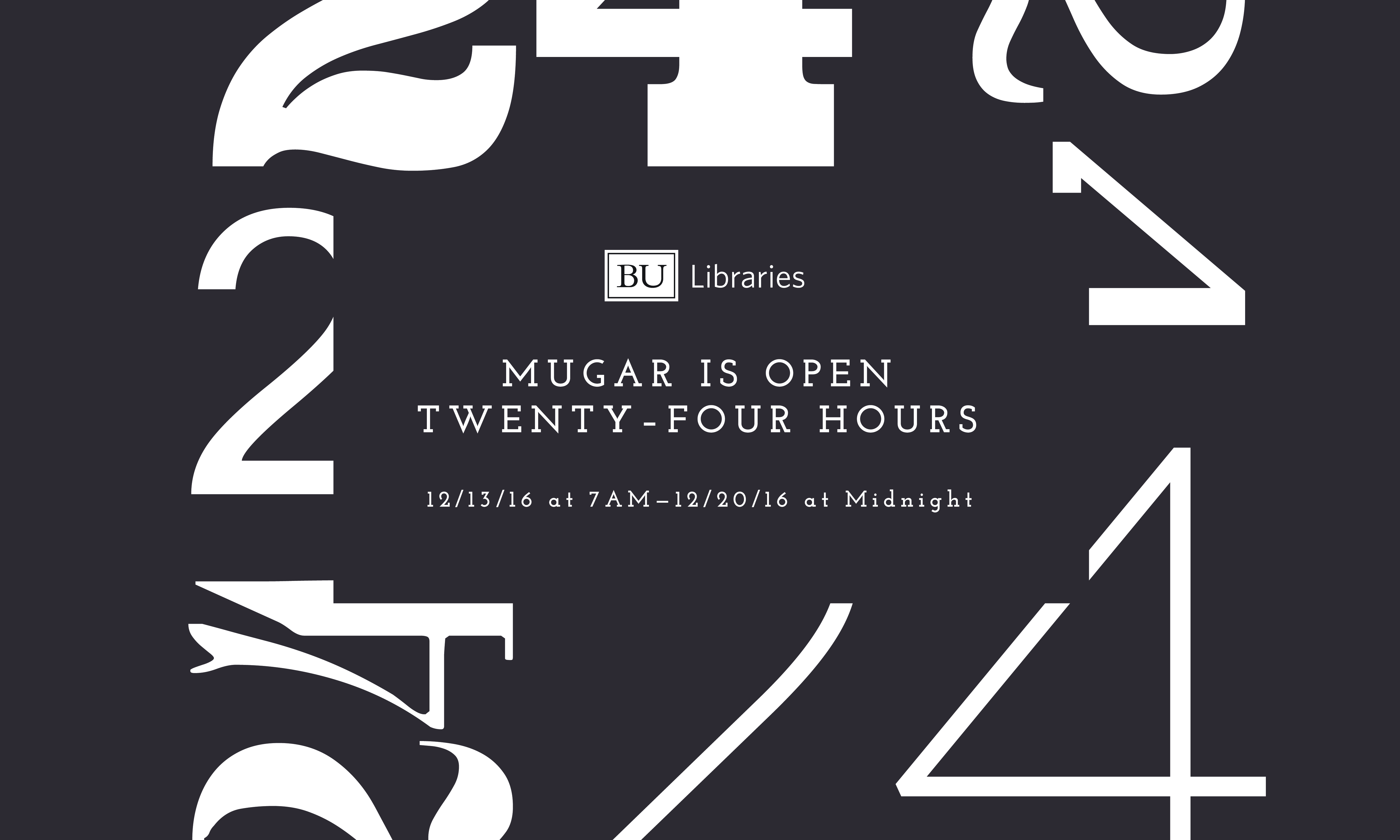 This poster was created by the Mugar Greene Scholars in order to make the students of Boston University aware of the Mugar Memorial Library's special schedule during exams.