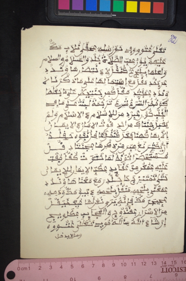 The material talks about how to perform acts of purification before praying. The material was written in Fuuta Jalon, Guinea in 1973. The material was digitized in Dakar, Senegal. The video contains El hadj Mouhamadou Sall sharing biographical information and details related to the acquisition and contents of these Ajami materials.