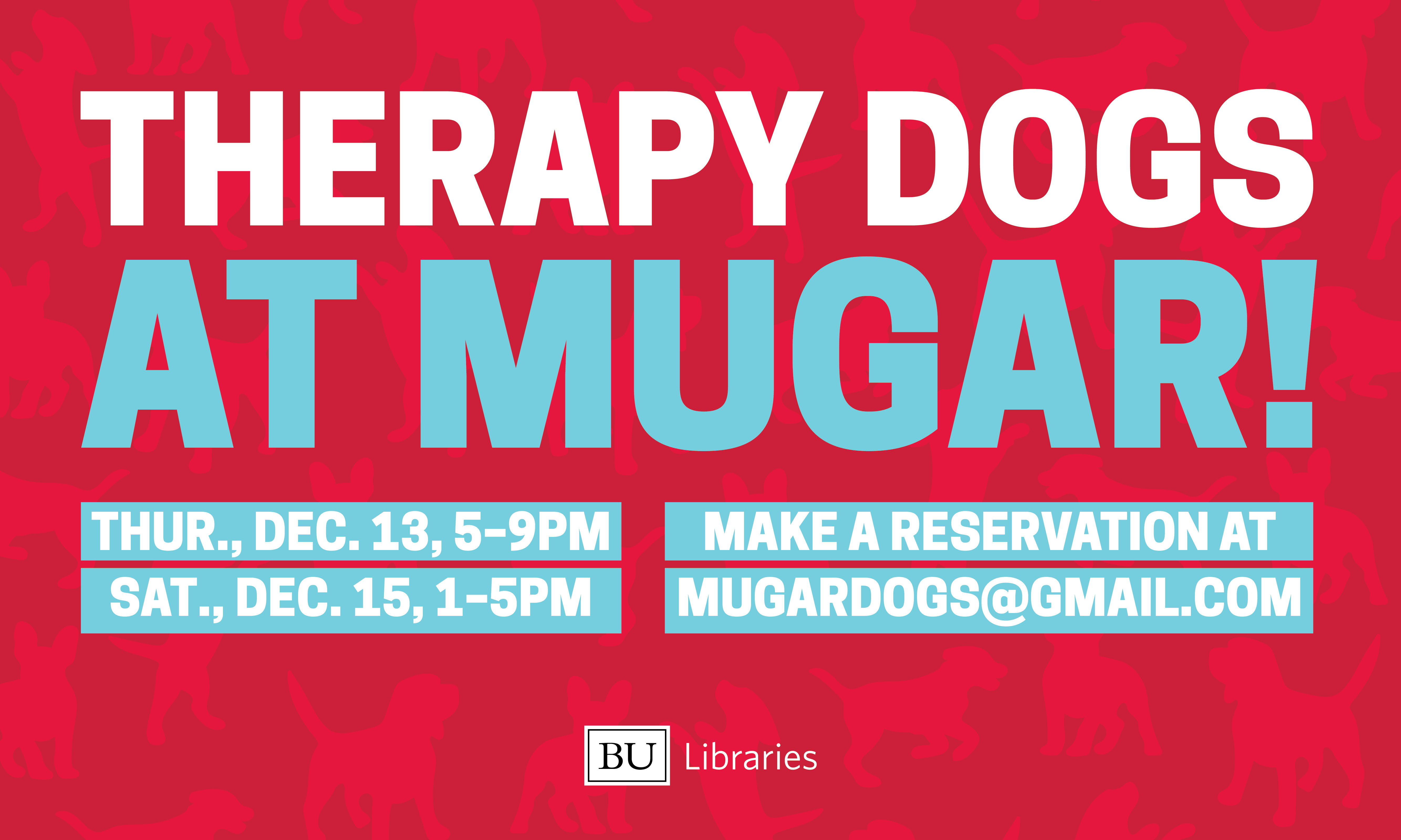 These posters were created to advertise a therapy dog event at Mugar for students during exam season.